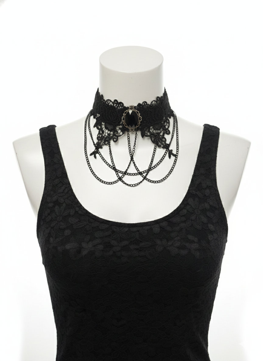 A Elegia Noturna combina uma base de renda preta floral de alta qualidade com um design em cascata. O destaque é o cabochão pedra preta central, uma joia profunda que evoca mistério. Dele, caem múltiplos fios de correntes metálicas que adicionam movimento e um charme vintage.