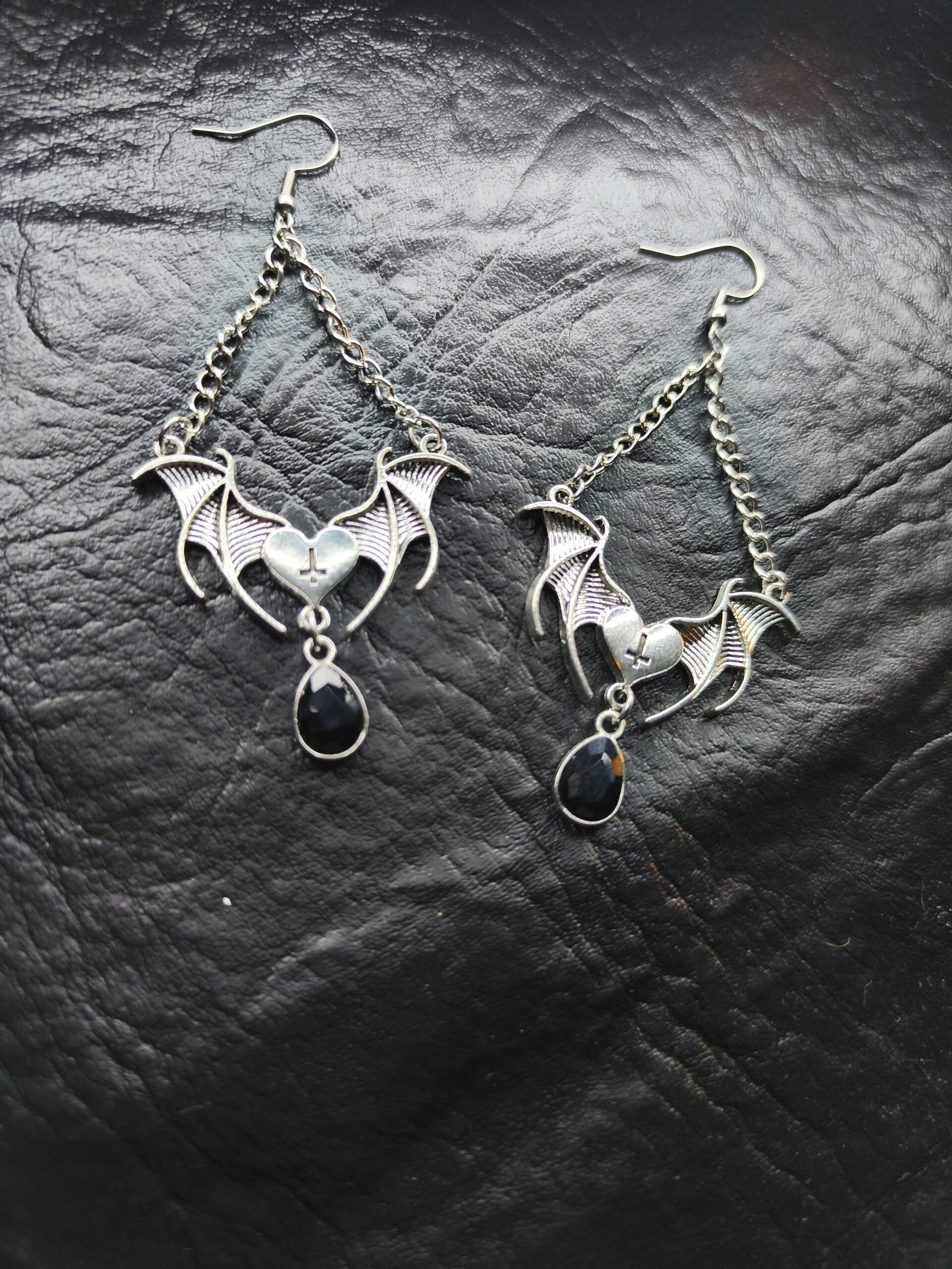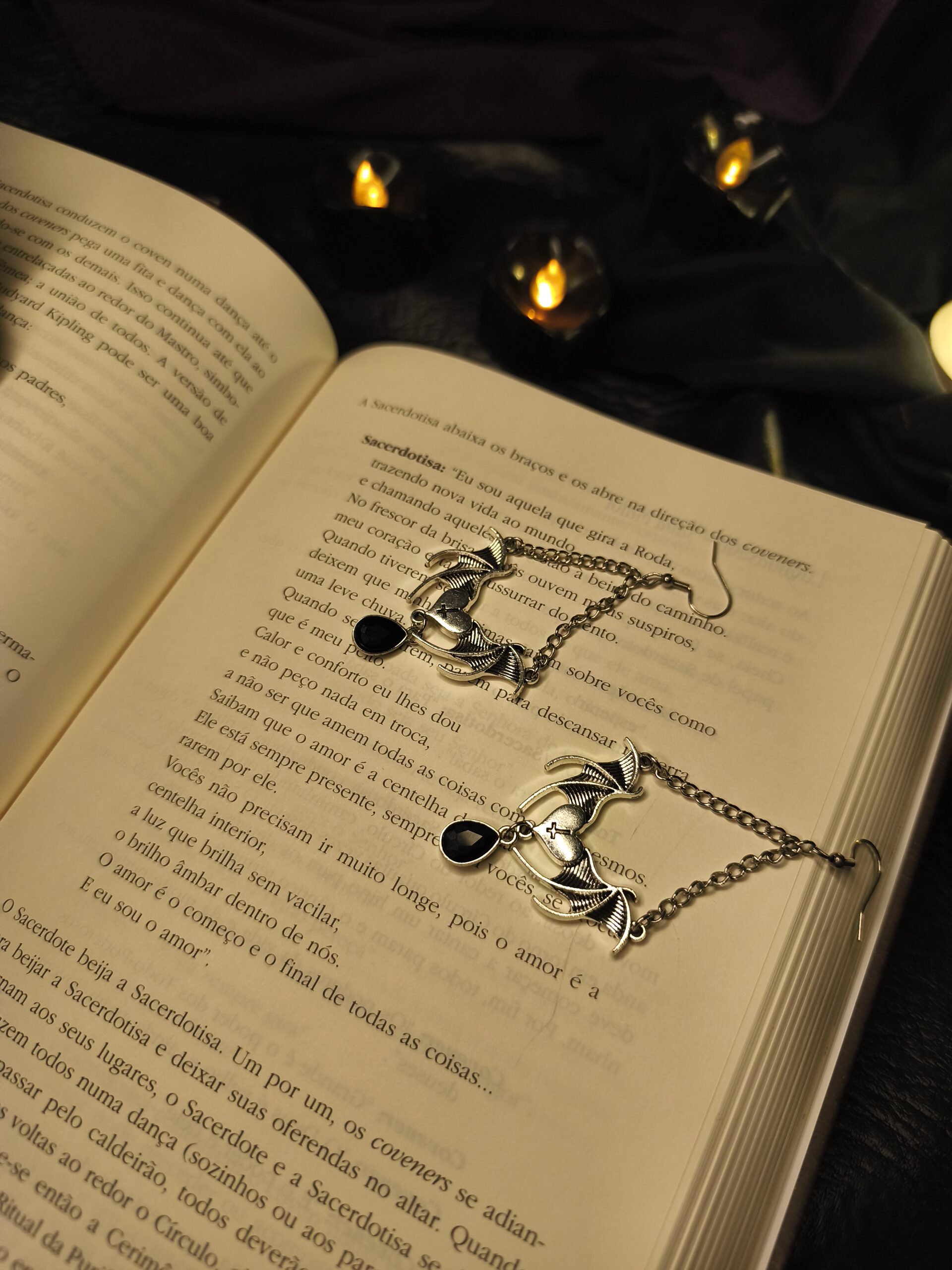 Mergulhe na elegância atemporal do luto e do mistério com o Brinco Gótico Gota Negra e Morcego. Este acessório impactante apresenta uma gota preta brilhante, simbolizando o mistério, o luto e a noite, suspensa por um topo em metal prateado escuro com detalhes de asa de morcego ou filigrana gótica. A combinação de preto e prata é a essência do estilo Gótico Clássico, Vampírico e Sombrio. É o toque final perfeito para um visual elegante, misterioso e com um apelo irresistivelmente dark.