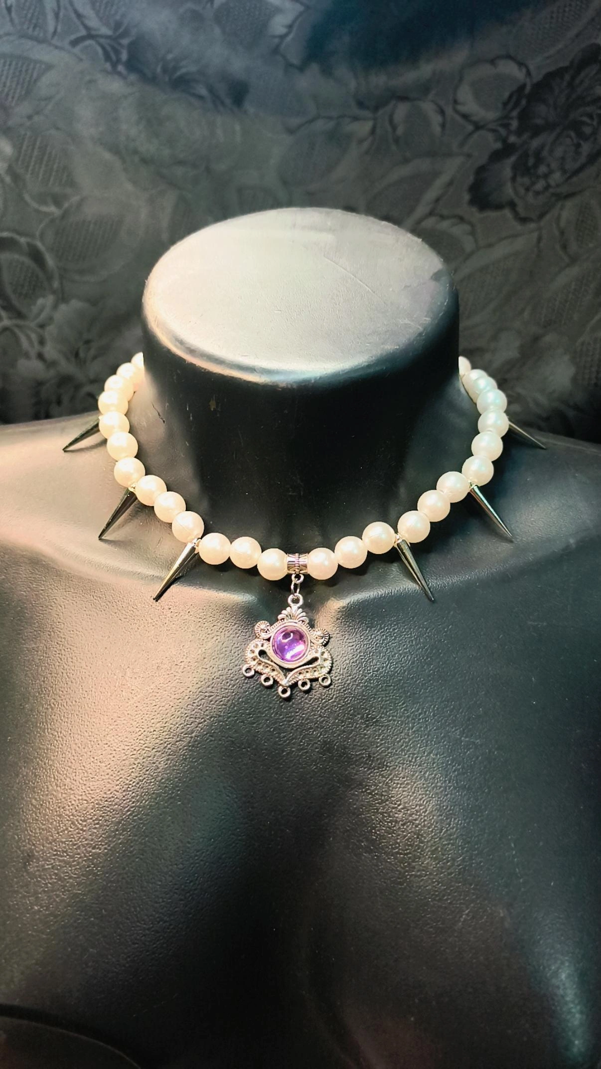 A nossa choker com miçangas peroladas é a peça perfeita para quem deseja um visual que equilibra elegância e rebeldia. Feita à mão, ela intercala o brilho clássico das pérolas sintéticas com spikes metálicos de alto impacto, criando um contraste único.