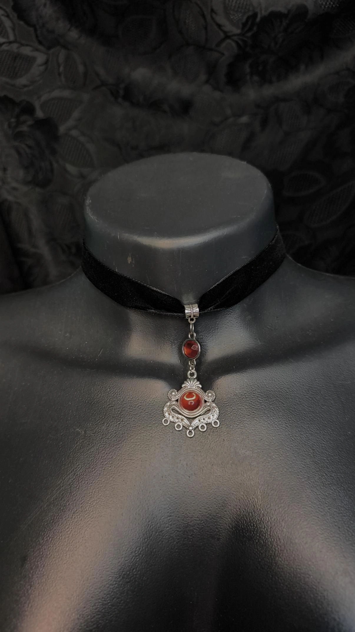 Esta choker de veludo com pingente é a peça fundamental para quem busca um acessório que une drama e sofisticação. A fita de veludo preto premium proporciona um toque macio e confortável, servindo de base para um medalhão vitoriano ricamente trabalhado em liga metálica.