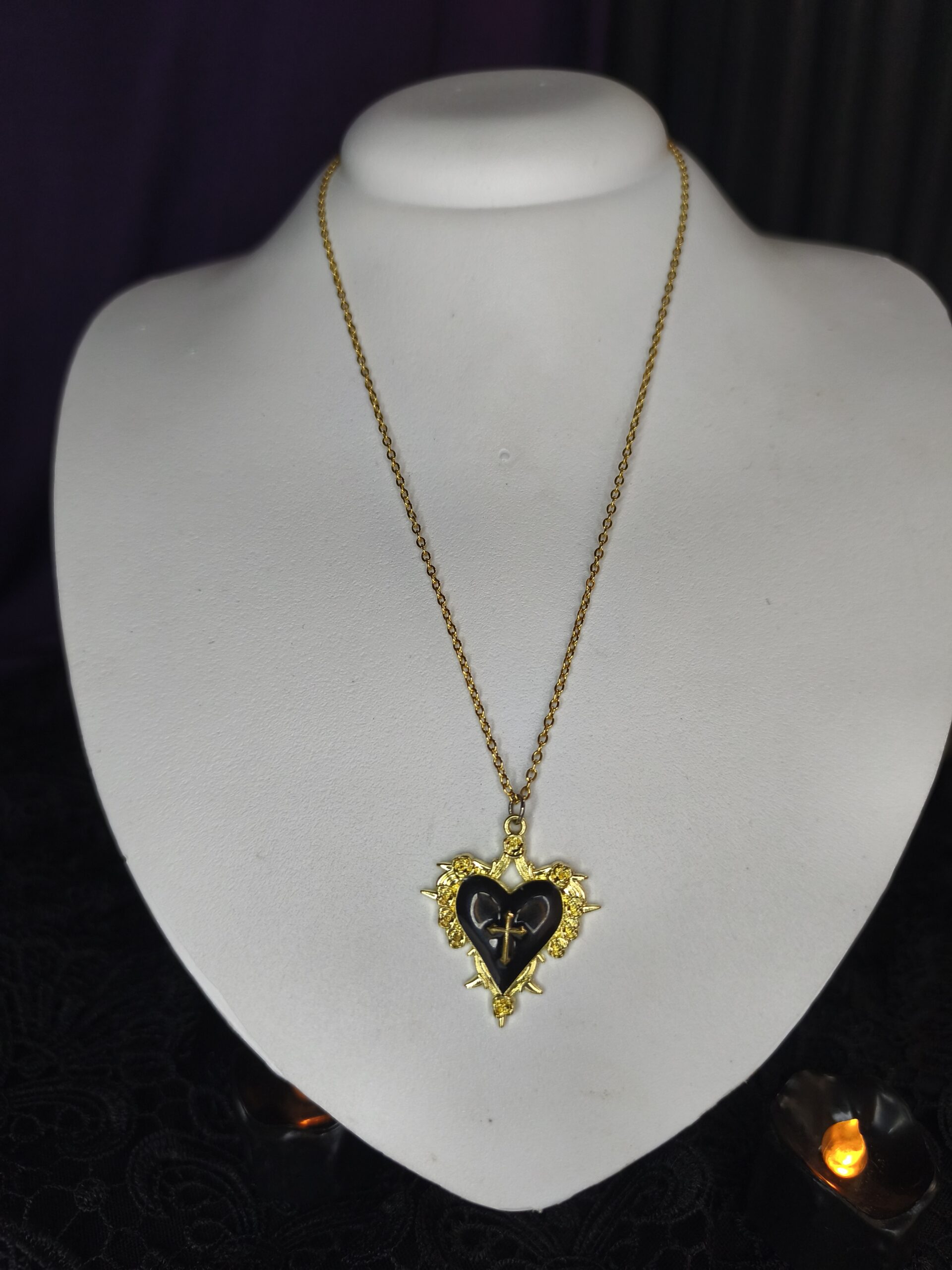 Invoque o luxo sombrio e o drama do Gótico Vitoriano com o Colar Gótico Coração Enamorado Preto e Dourado. Este pingente expressivo apresenta um coração esmaltado em preto profundo, simbolizando o luto e o mistério, adornado por uma cruz e uma coroa de espinhos estilizada em metal dourado vibrante. Esta combinação de preto e dourado é a personificação da elegância gótica de alto contraste, perfeita para o estilo Gótico Vampírico, Vitoriano e para quem busca uma peça que remete ao Coração Sagrado com um toque de opulência sombria.