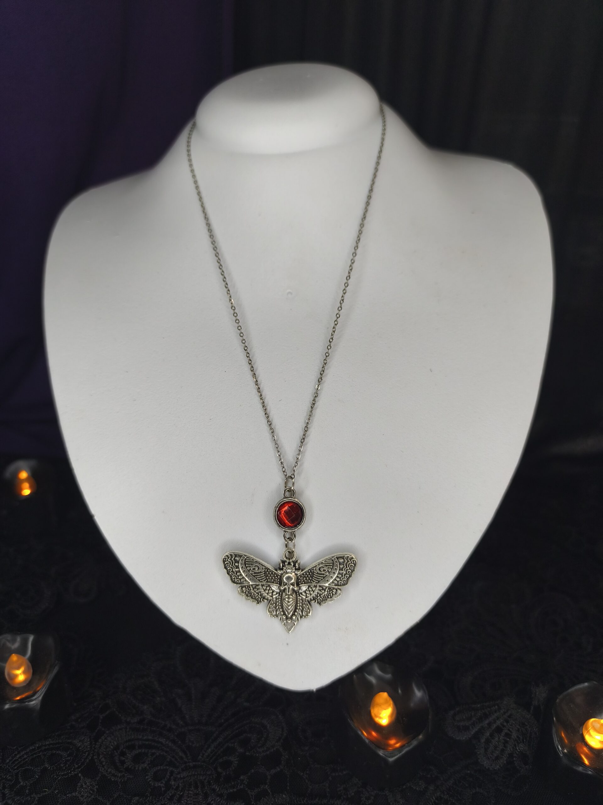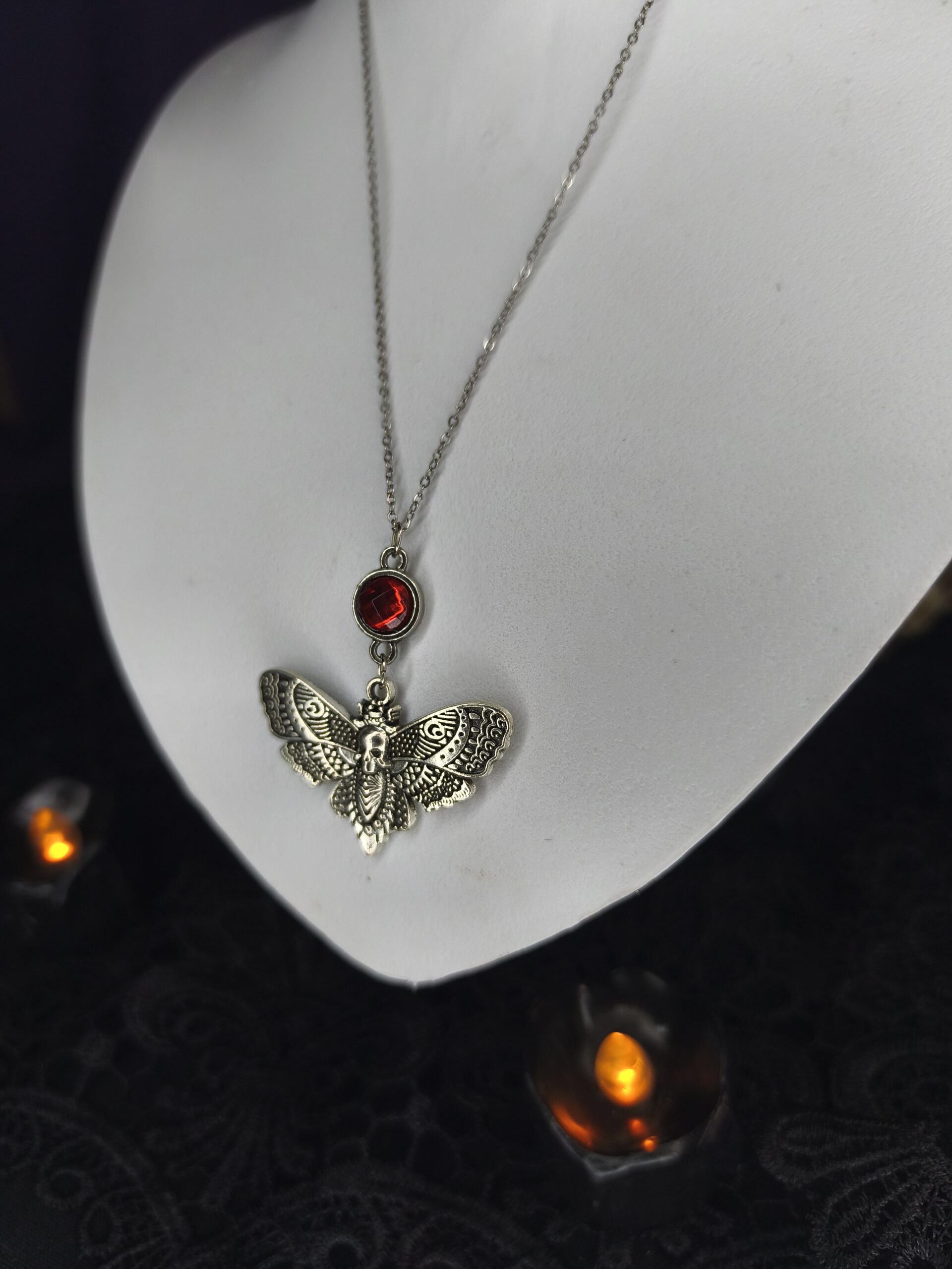 Invoque a paixão sombria e a fascinação pelo destino com o Colar Gótico Mariposa da Morte e Rubi. Este pingente exclusivo apresenta a famosa Traça Esqueleto (Death’s-head Hawkmoth), que é suspensa por um cabochão de Rubi (pedra vermelha intensa). O simbolismo da mariposa remete à morte, transformação e ocultismo, enquanto o Rubi adiciona um toque de paixão, drama e luxo vampírico. O metal em tom prateado envelhecido confere autenticidade, sendo a peça ideal para o estilo Gótico Romântico, Vampírico e para quem busca uma joia carregada de significado e intensidade.
