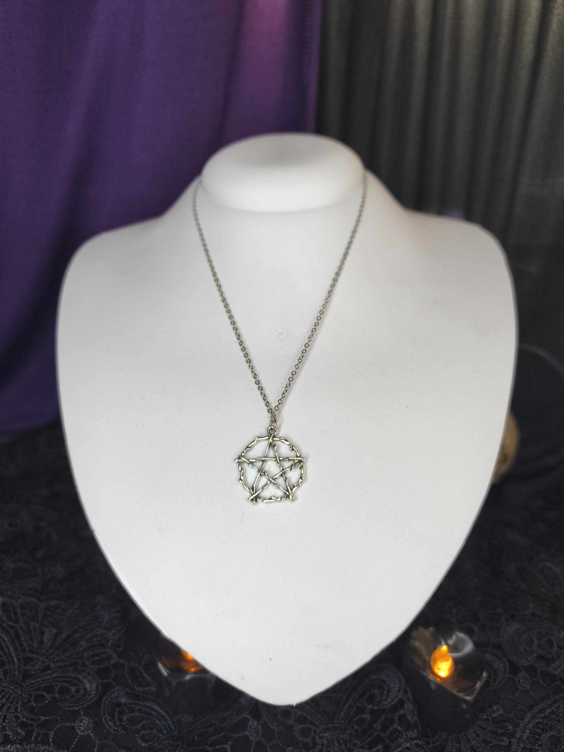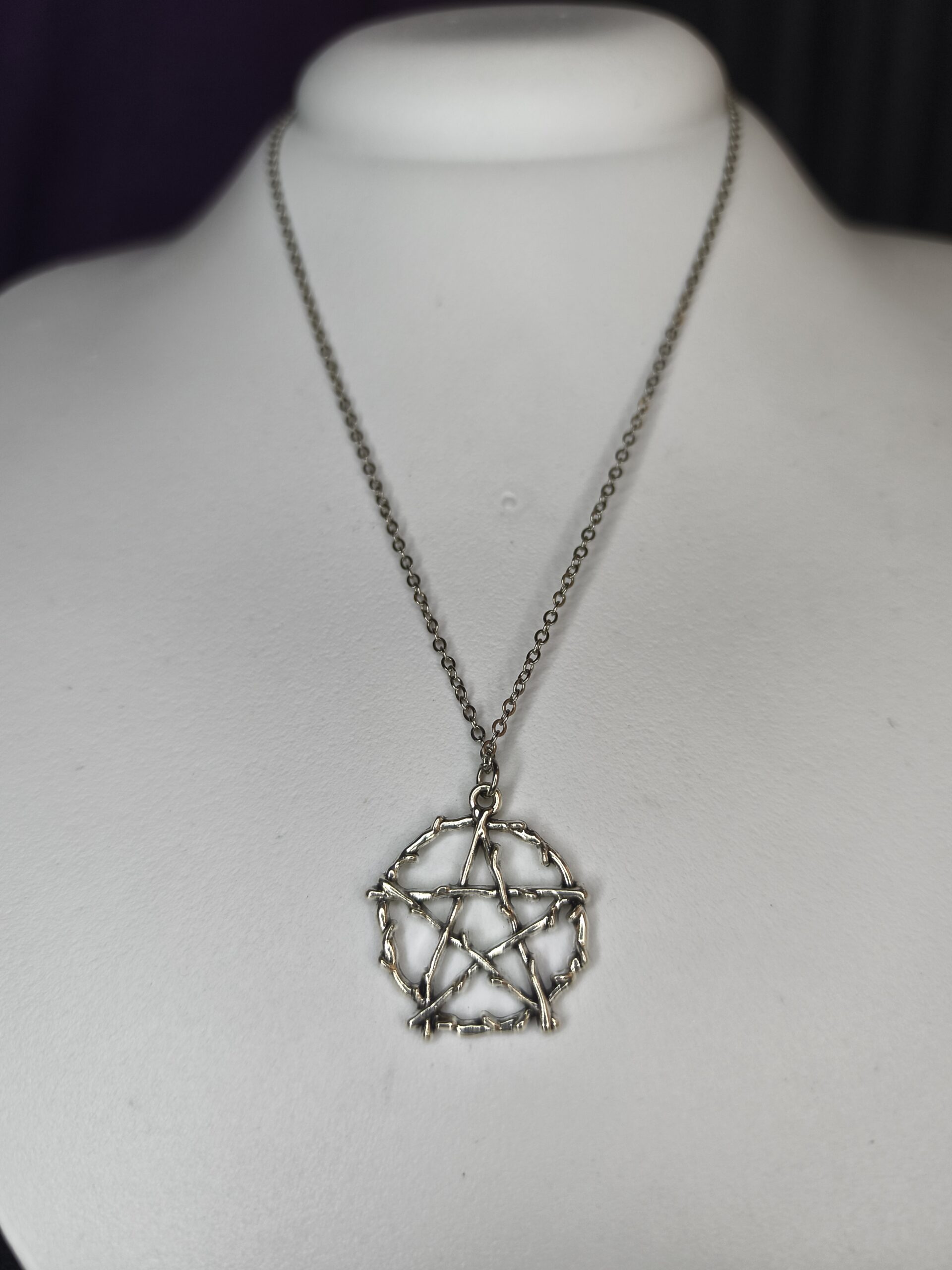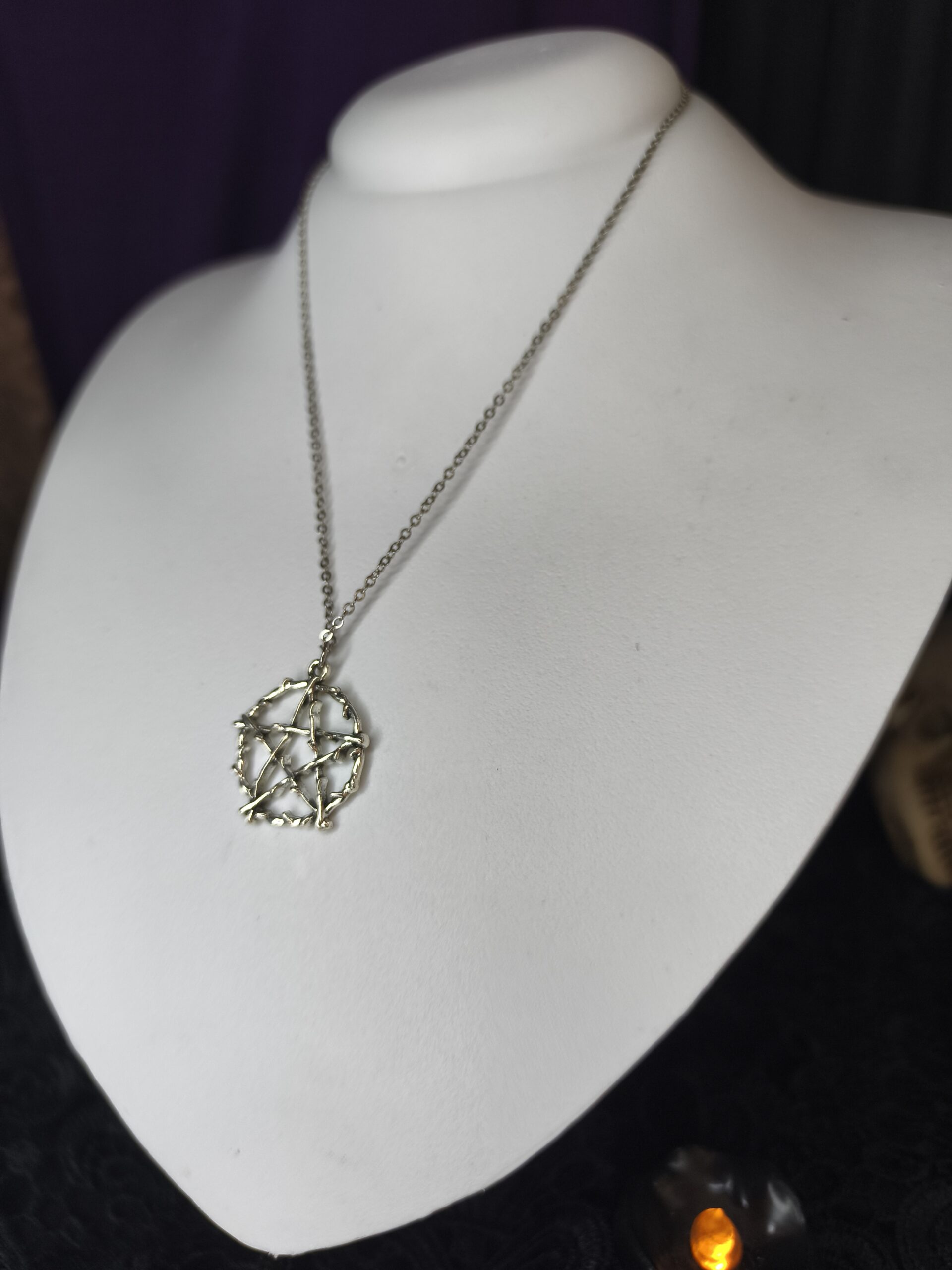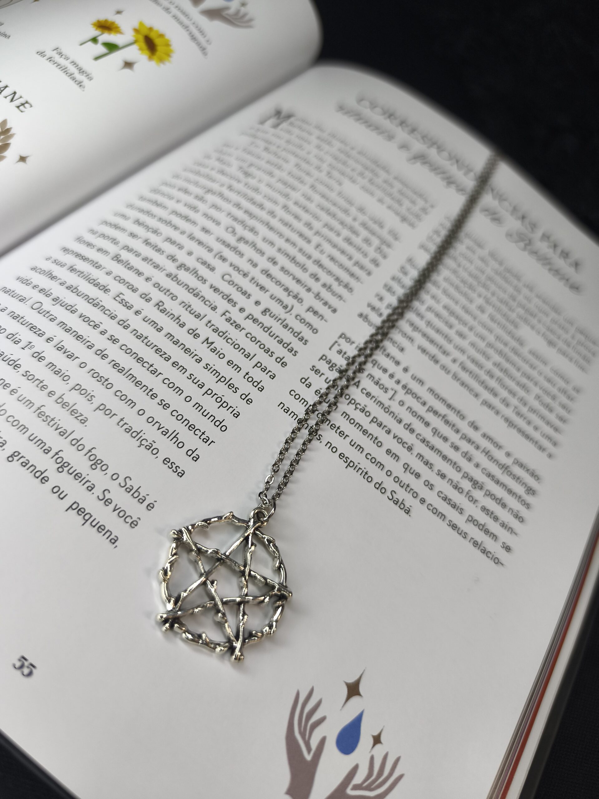Adote a estética da natureza e da magia antiga com o Colar Gótico Pentagrama Bruxo. Este pingente singular apresenta o Pentagrama (símbolo de proteção e dos elementos) em um design rústico, que simula fios ou galhos enrolados e interligados. O acabamento em metal prateado envelhecido confere um visual autêntico e tribal. É a joia perfeita para quem segue o caminho Wicca, aprecia o estilo Gótico Rústico (Gótico Pagan/Bruxo) e busca um amuleto que remete ao trabalho artesanal e aos rituais da natureza.