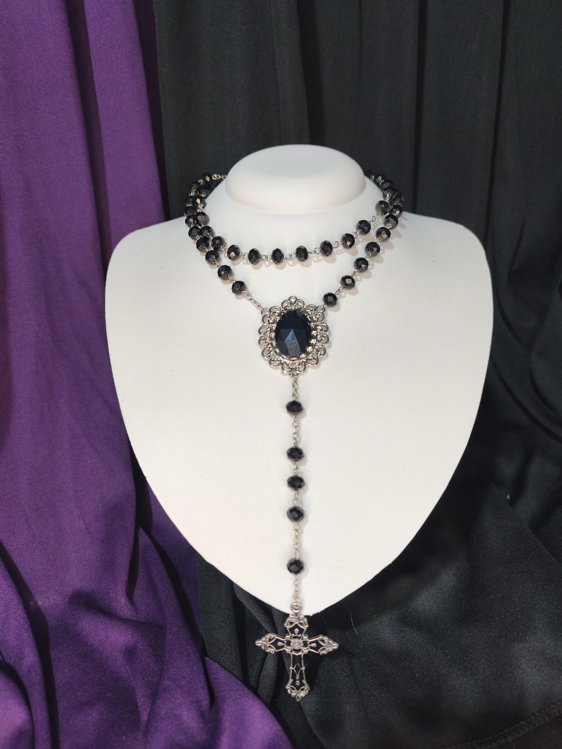 Adote a elegância sombria e a devoção dramática com o Colar Rosário Gótico de Contas Pretas. Este acessório segue o design clássico de um Terço/Rosário, mas é adornado com contas pretas cintilantes e um metal prateado envelhecido, conferindo-lhe uma estética luxuosamente gótica. O destaque é o Medalhão Central Ornamentado e a Cruz Vitoriana Detalhada na extremidade, que reforçam o estilo Gótico Romântico e Vitoriano. É uma joia de impacto, ideal para sobreposições ou para ser usada como peça central no seu visual dark.