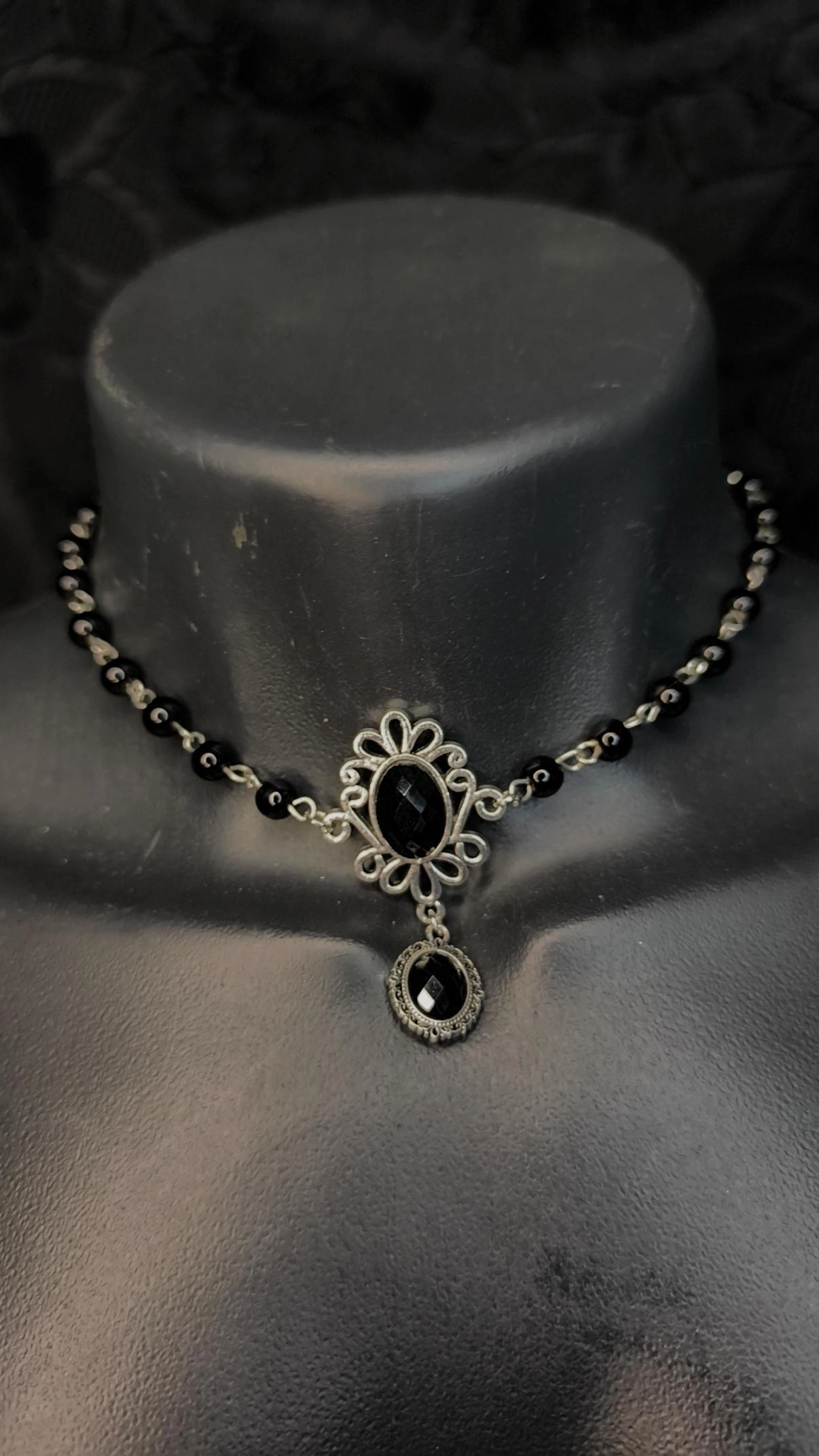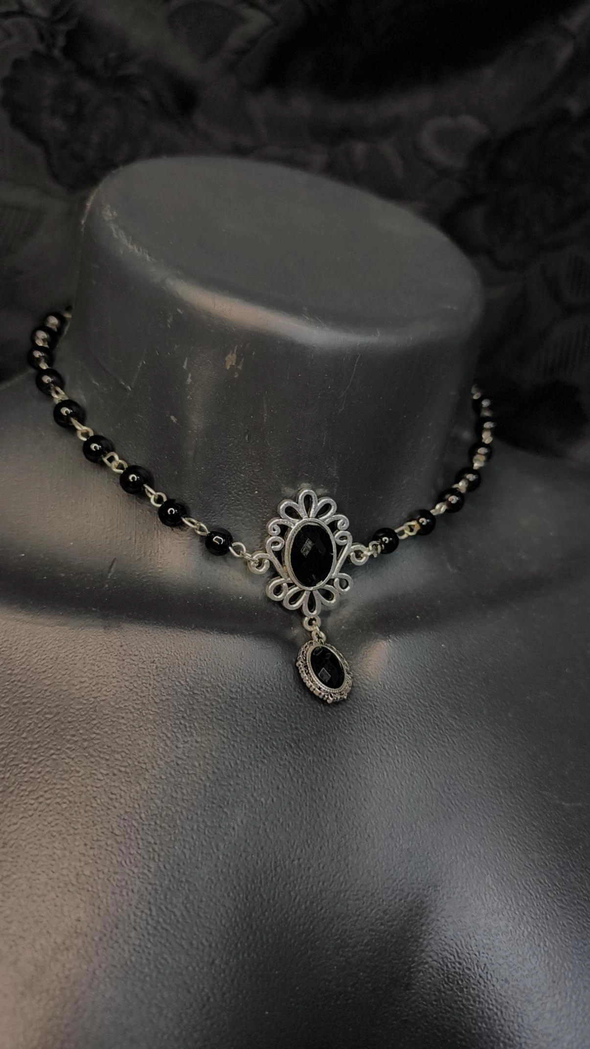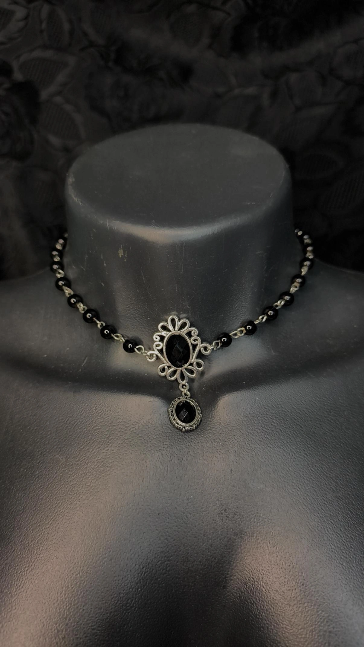 Esta gargantilha de miçangas pretas é a peça perfeita para quem procura unir a estética gótica clássica com um toque de delicadeza. Montada artesanalmente, a peça apresenta contas pretas brilhantes que conduzem o olhar para um medalhão vitoriano central, ricamente trabalhado em liga metálica prateada com uma gema preta facetada.
