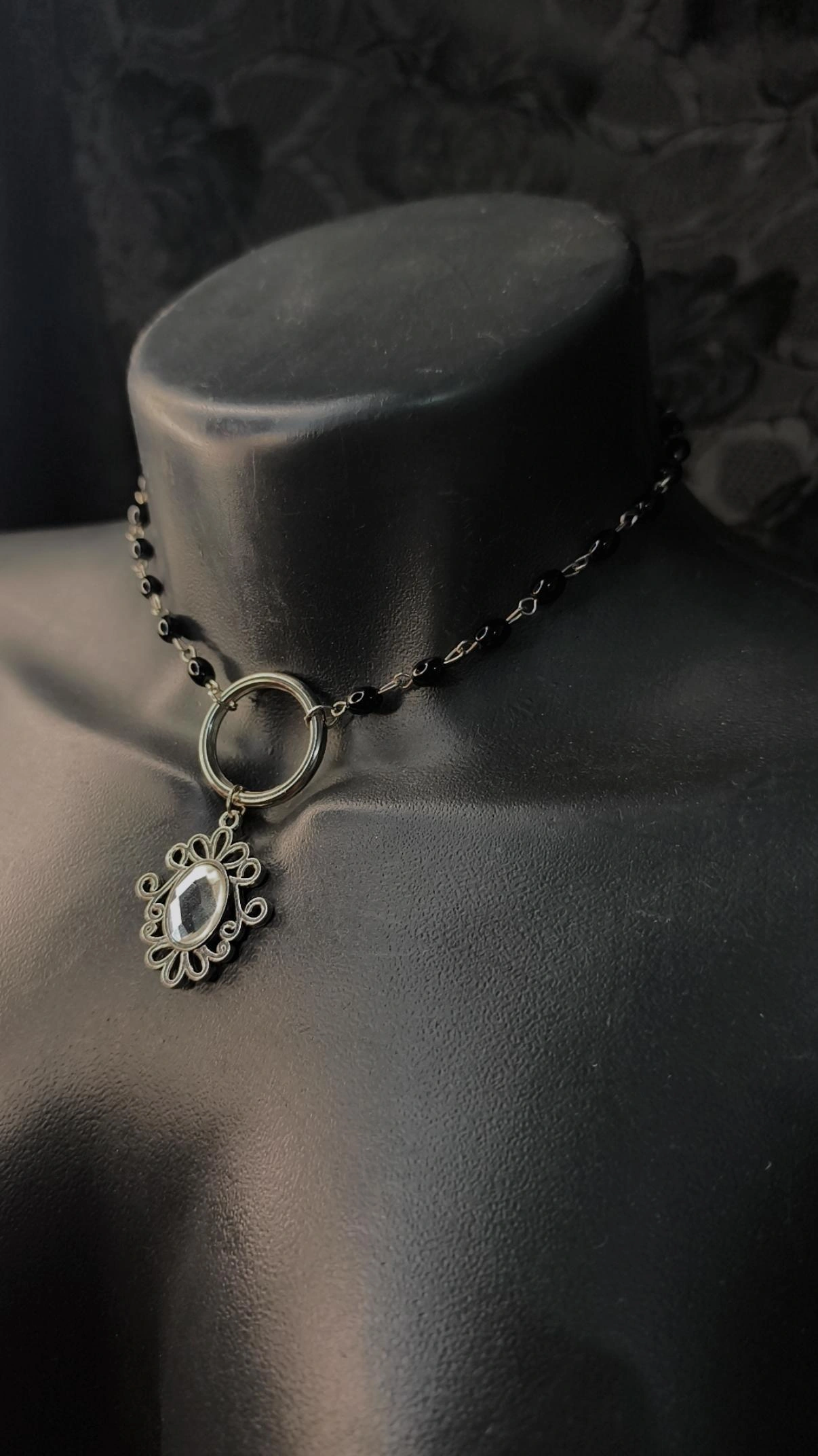 Este colar de miçanga preto com pingente é a união perfeita entre o clássico e o moderno. Feito com miçangas selecionadas, o colar de miçanga preto com pingente apresenta uma argola central robusta que sustenta um medalhão ornamental rico em detalhes.