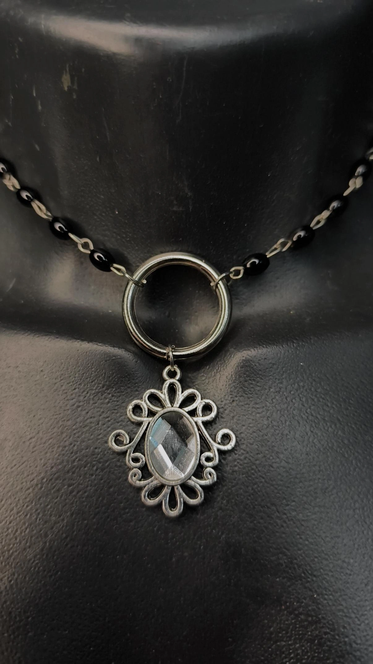 Colar de miçanga preto com pingente ornamental e argola em liga