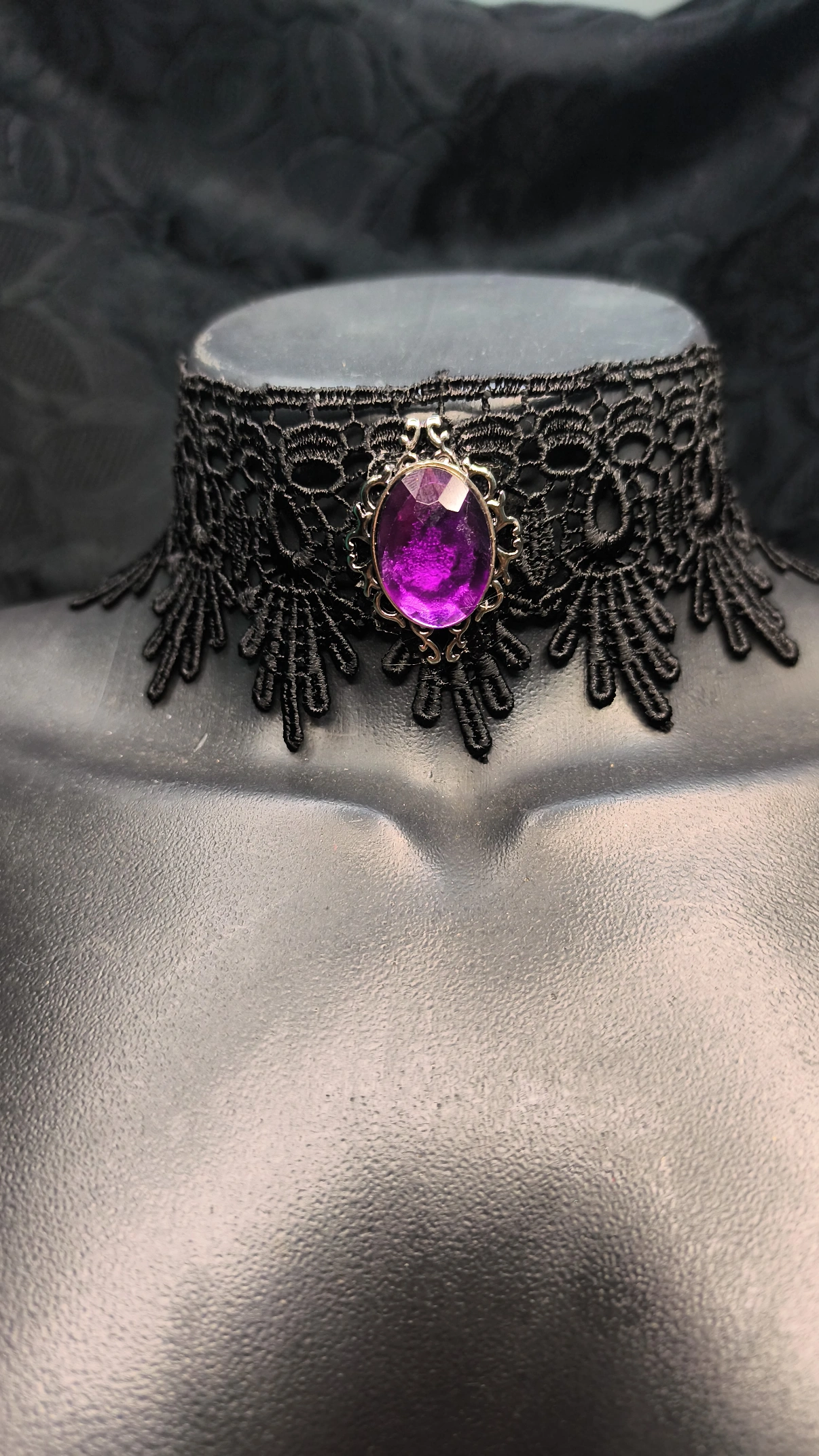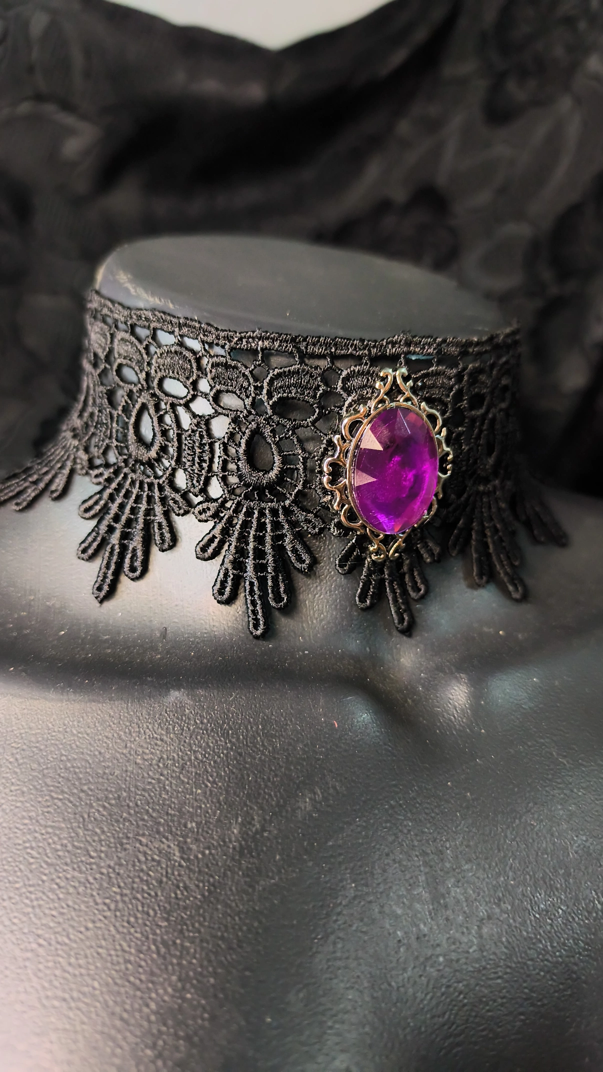 Esta gargantilha de renda com camafeu é a expressão máxima da elegância dark. Confeccionada com renda guipure de alta qualidade, a peça apresenta um medalhão central em liga metálica que emoldura um camafeu roxo vibrante e facetado.