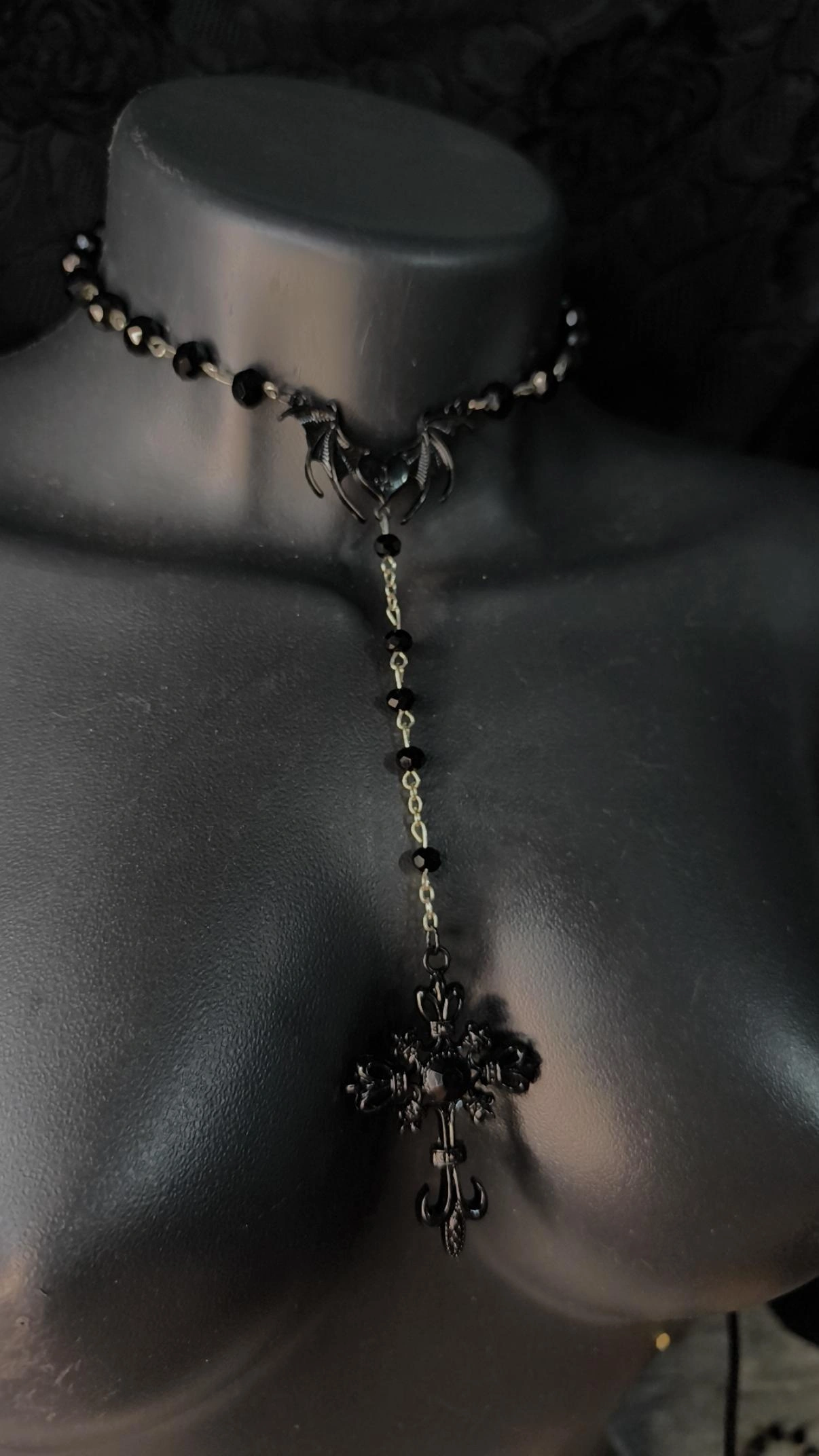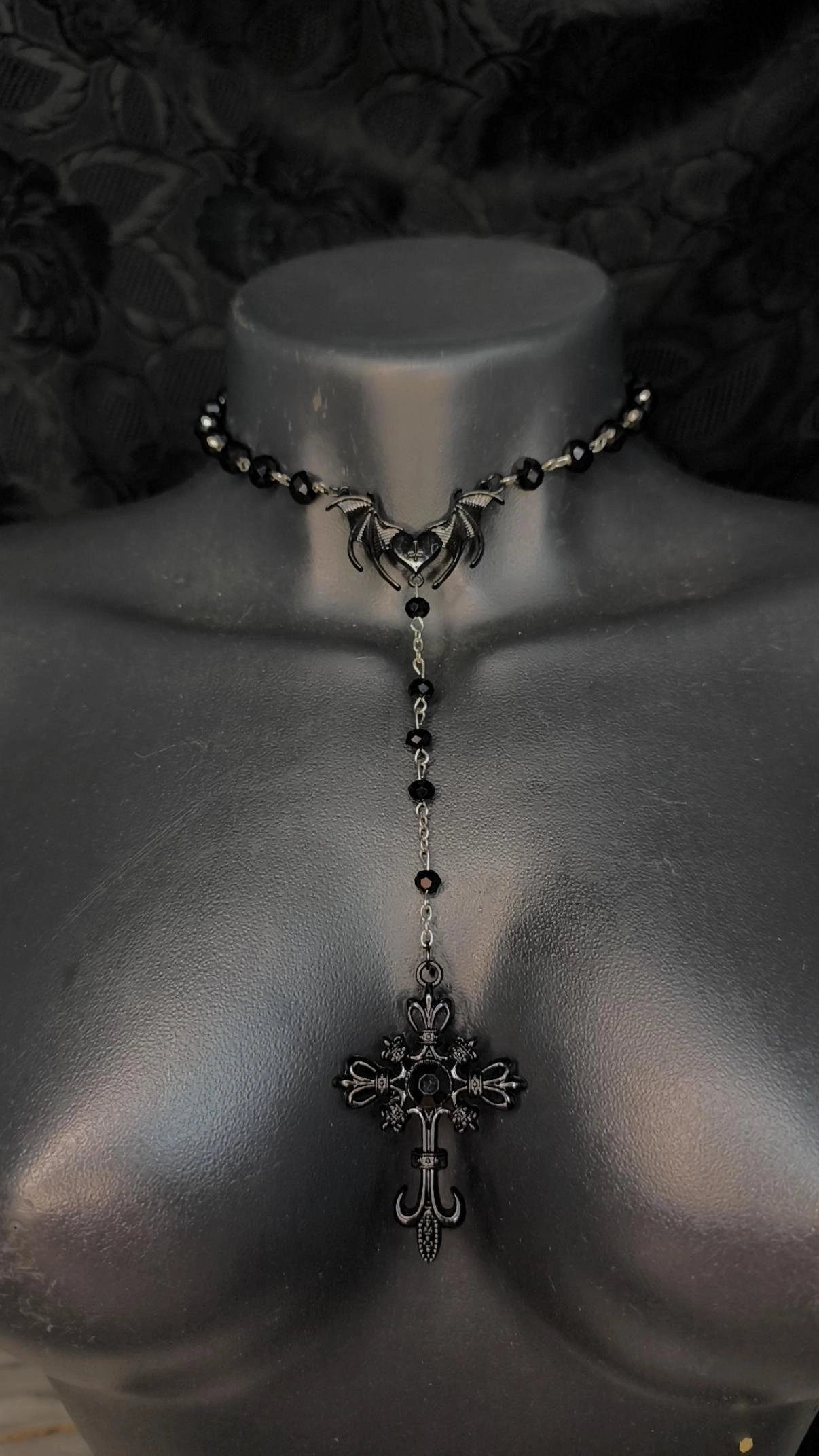 Adicione drama ao seu visual com o rosário gótico de morcego. Uma peça artesanal exclusiva com cruz ornamental, perfeita para os estilos Vampire e Trad Goth.
